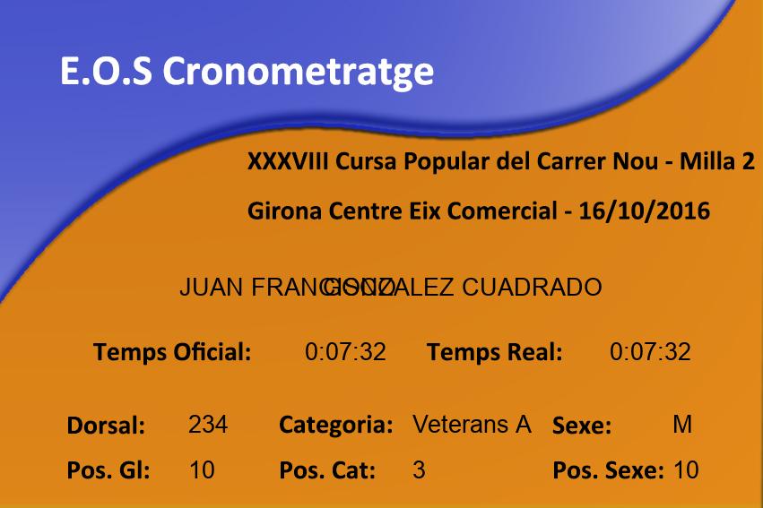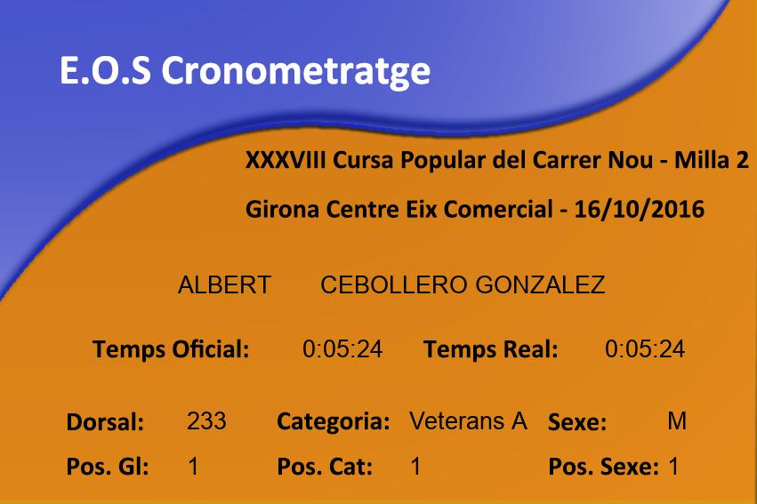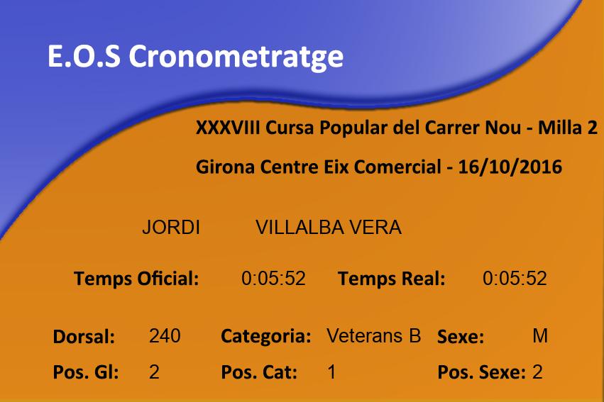 Sexe: M Pos. Sexe: 2 Club: J.A.SABADELL Min/km: 3:39 Cat: Veterans B Class. Cat: 1 Organisme: Temps Oficial: 0:05:52 Temps Real: 0:05:52 |