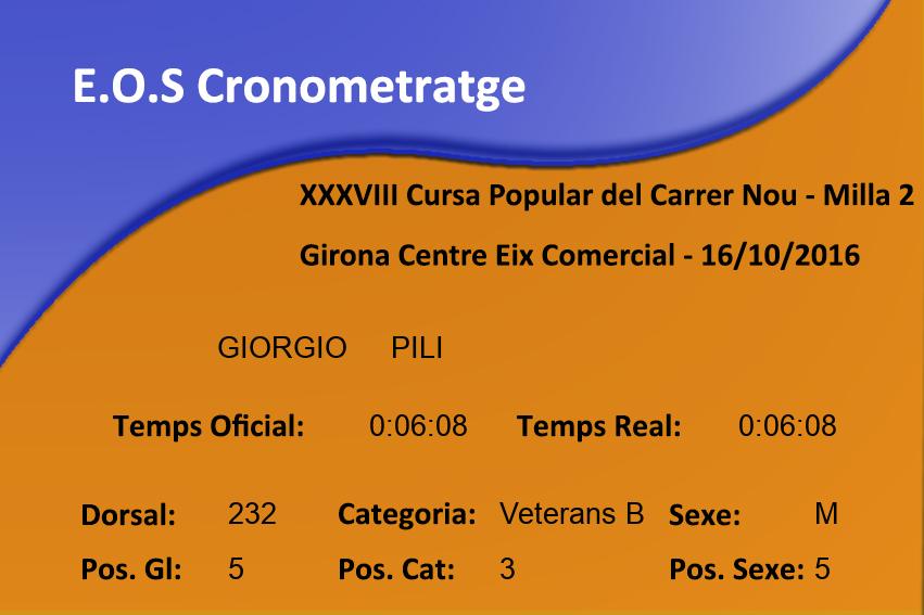 Sexe: M Pos. Sexe: 4 Club: INDEPENDENT Min/km: 3:44 Cat: Veterans B Class. Cat: 2 Organisme: Temps Oficial: 0:06:00 Temps Real: 0:06:00 |