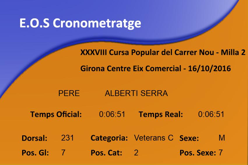 Sexe: M Pos. Sexe: 3 Club: PENYA APA ANEM-HI Min/km: 3:41 Cat: Veterans A Class. Cat: 2 Organisme: Temps Oficial: 0:05:56 Temps Real: 0:05:56 |